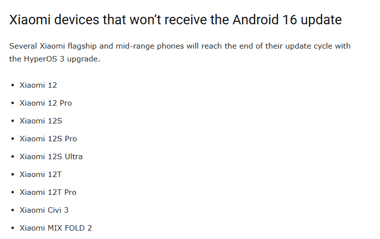 Xiaomi Time公布的名单显示,小米数字系列和MIX系列中的多款旗舰机型包括小米12、小米12 Pro、小米12S、小米12S Pro、小米12S Ultra、小米12T、小米12T Pro、小米Civi 3以及小米MIX FOLD 2等均无法升级支持Android 16。